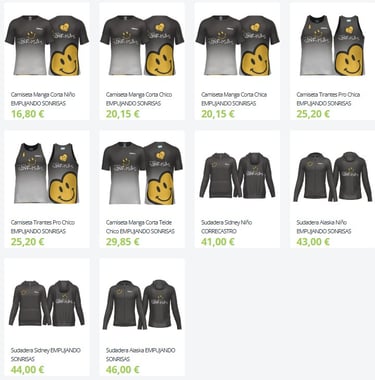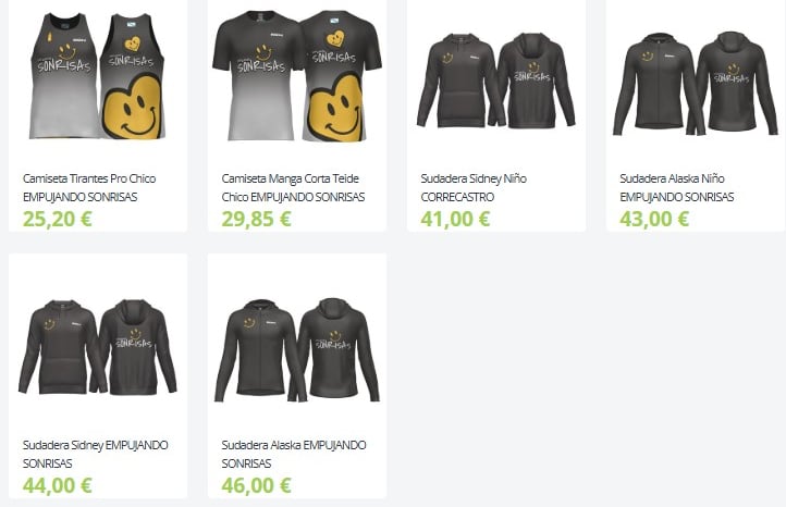 En Empujando Sonrisas nuestro principal objetivo es difundir un mensaje de diversidad, inclusión e integración dentro del mundo del atletismo popular. Gracias al apoyo social recibido, estamos consiguiendo que hoy en día sea más fácil participar en carreras populares con sillas adaptadas. Nuestro mayor premio y reconocimiento es seguir uniendo fuerzas para dibujar cada vez más sonrisas. Si te sientes identificado con nuestro mensaje y quieres ayudarnos a difundirlo, aquí encontrarás algunos de nuestros productos. Todos ellos son a precio de coste, no obtenemos ningún beneficio de ellos porque somos un colectivo autofinanciado que no queremos obtener ningún lucro de aportaciones de terceros.
