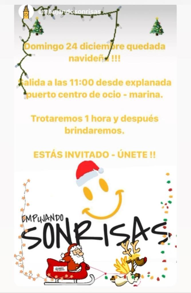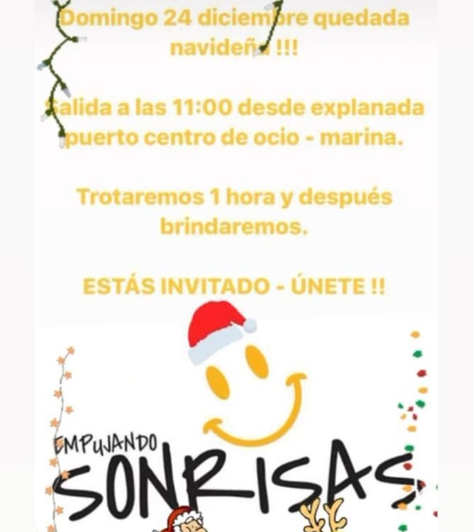Comer, comer y más comer. Las fiestas navideñas son una época para disfrutar de nuestros seres queridos alrededor de la mesa. Es probable que pasados estos días nos cueste abrocharnos los pantalones... Por eso, queremos proponeros un plan perfecto: iniciar las Navidades corriendo en la mejor de las compañías. ¡Únete a la tribu el 24 de diciembre! Saldremos a las 11 desde la explanada del puerto centro de ocio - marina, trotaremos una hora y brindaremos juntos (sin remordimientos) por todo lo bueno que nos ha sucedido y por lo que está por llegar.